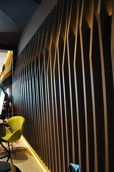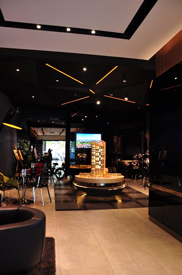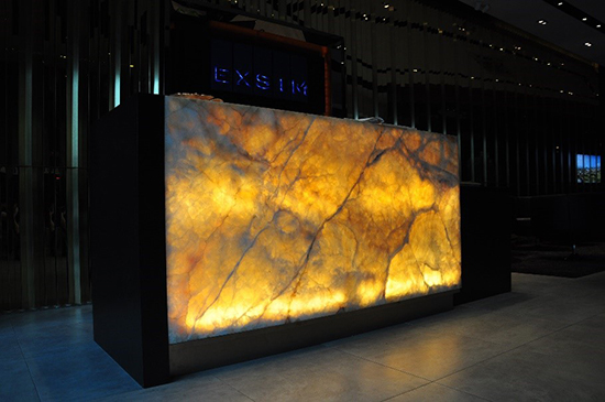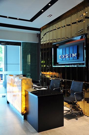 EXSIM OFFICE The wooden panels adds a sophisticated touch to the outlook on the ground floor. With the high ceiling walls, the space became spacious and luxurious. The granite lit reception creates a very special illumination effect in the office.